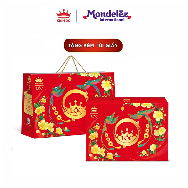 Hộp quà tết kinh đô Lộc Phú Quý thiết kế cứng cáp, sang trọng với những hình ảnh ý nghĩa, đậm chất Tết, cùng hiệu ứng in ấn bắt mắt, hiện đại, phù hợp làm quà biếu tăng nhân viên.